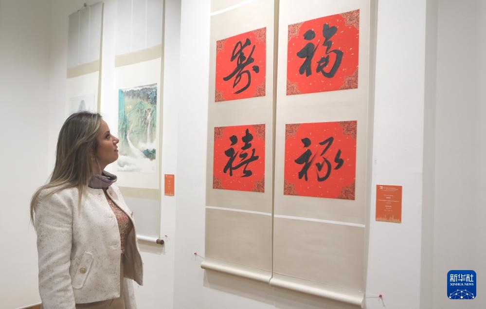 9月8日,在比利时布鲁塞尔,观众在“五彩海上”当代海派书画名家邀请展现场参观。新华社记者 潘革平 摄