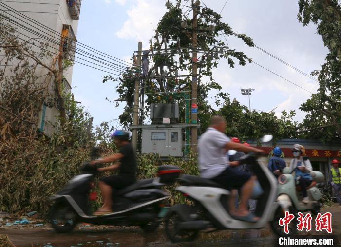 9月9日,海口一处街道,骑着电动自行车的市民路过一处正在维修的变压器。中新网记者 王晓斌 摄