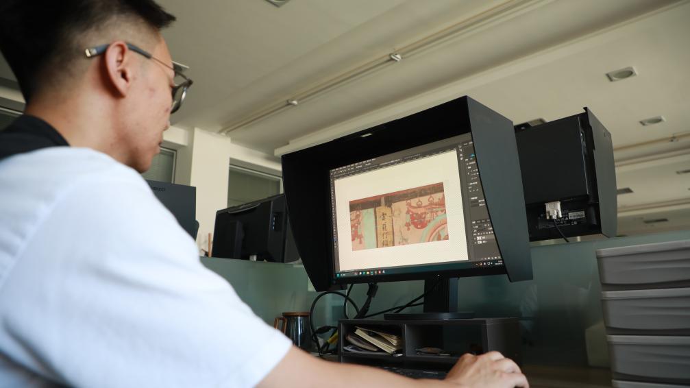 2024年8月22日,敦煌研究院文物数字化保护团队工作人员陈鑫正在进行莫高窟壁画的数字化保护工作。新华社记者 张睿 摄