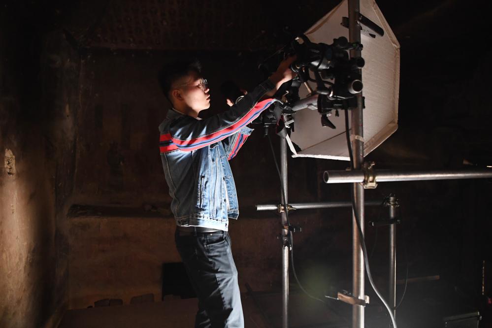 2023年4月25日,敦煌研究院文物数字化保护团队图像采集人员熊业腾在洞窟内调试设备,准备进行壁画图像采集。新华社记者 陈斌 摄