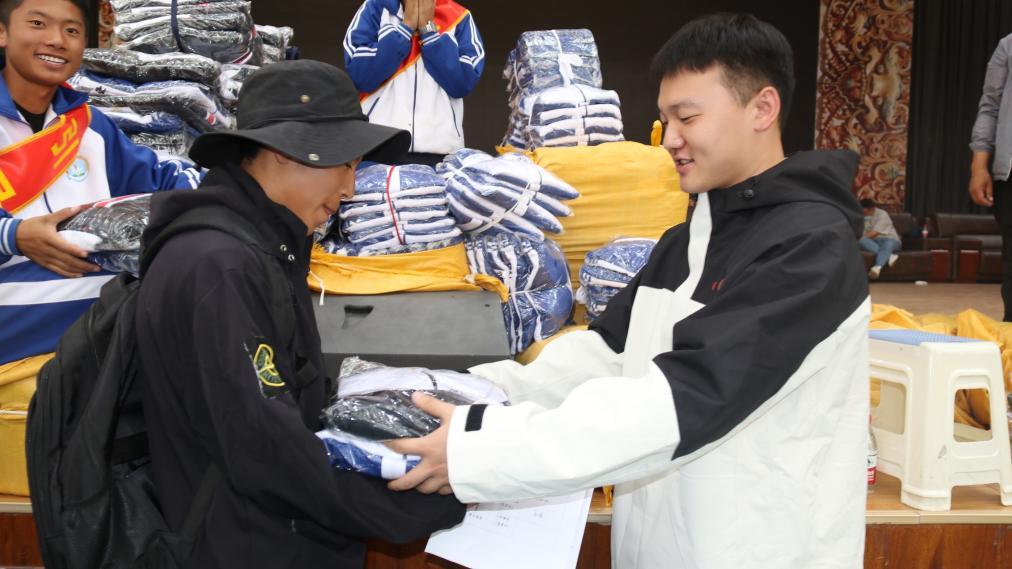 9月6日,中央民族大学第26届研究生支教团成员侯宇航(右)为拉萨那曲第二高级中学报到新生发放生活用品。(嘎玛曲宗 摄)
