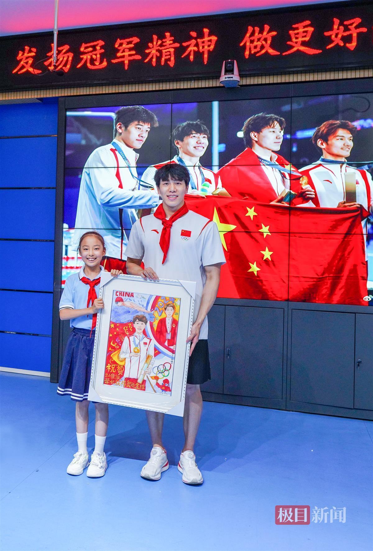 孙佳俊所到之处,被井冈山小学的学弟学妹们的热情和欢呼包围。同学们也用自己的方式对“偶像”表达着喜爱之情。“孙佳俊哥哥,你去年亚运会夺冠时我就特别崇拜你,现在你又在巴黎夺得了奥运金牌,我要向你学习,将来为祖国争光!”六年级(5)班刘梓琳同学将自己对奥运冠军的敬仰融入绘画中,亲手送给孙佳俊。六年级(2)班的陈南希同学把亲手制作、印有“井小优秀校友”字样的奖牌,挂在孙佳俊的胸前。陈南希也是一名游泳特长生,长项同为蝶泳的他,早已将孙佳俊视作自己的榜样,他最敬佩的就是孙佳俊学长身上的敢于挑战、永不言败的冠军精神。