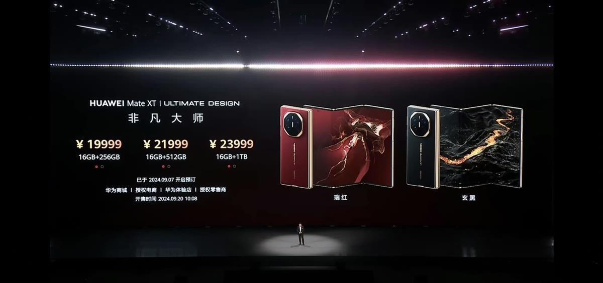 据媒体报道,9月10日的华为见非凡品牌盛典上,华为首款三折叠屏手机Mate XT非凡大师正式发布。该机型展开最大10.2英寸、最薄3.6毫米,共有黑、红两种颜色,256GB版本售价19999元、512GB版本售价21999元、1TB版本售价23999元。