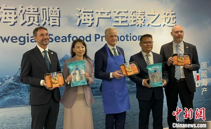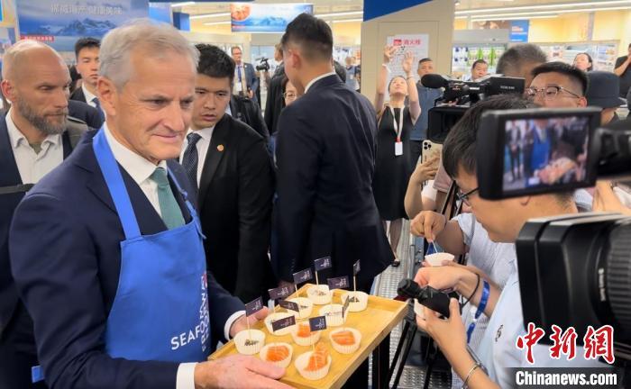 中新社上海9月10日电 (记者 缪璐)10日晚间,挪威首相斯特勒现身上海东虹桥中心,在简单参观后,便穿上蓝色围裙,现场“带货”自家海产品。他端着餐盘,一边邀请大家品尝挪威三文鱼和青花鱼,一边介绍道:“快试试,很新鲜。”