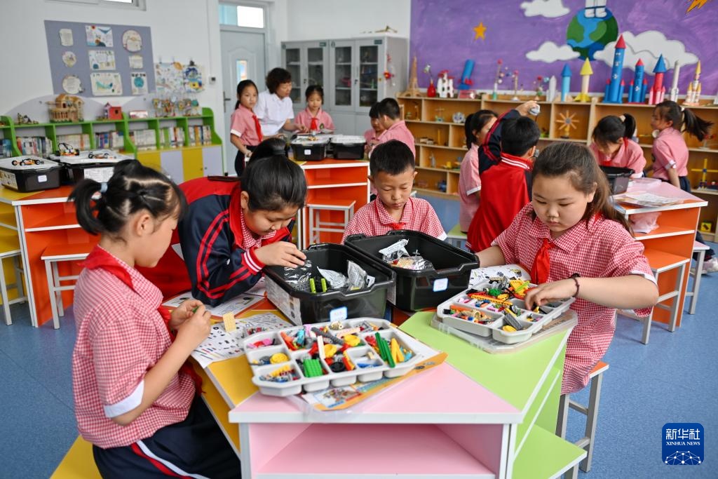 安新县端村学校学生在科技活动室内组装机器人。新华社记者 牟宇 摄