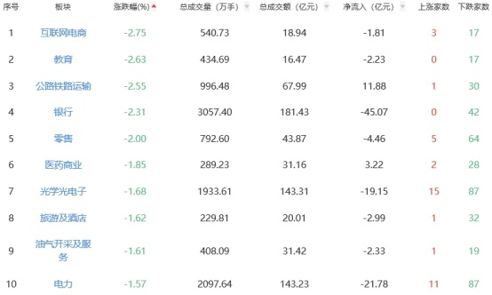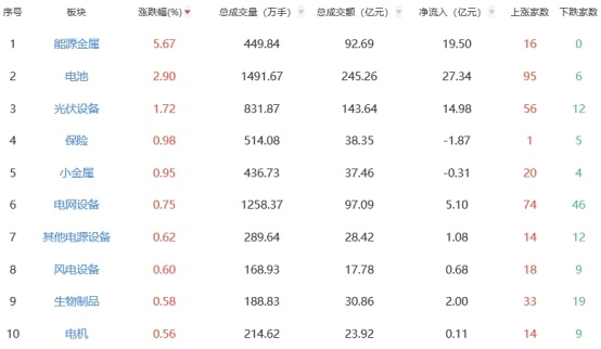 板块方面,能源金属、电池、光伏设备板块涨幅居前,互联网电商、教育、公路铁路运输板块跌幅居前。