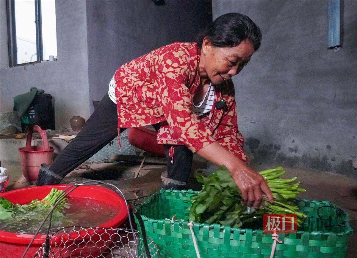从后院打起清澈凉爽的井水,罗学珍麻溜地给刚刚摘回的蔬菜瓜果洗了个澡。叶片和果实表面的尘土被洗掉后,挂满晶莹的水珠,看上去更加鲜嫩。