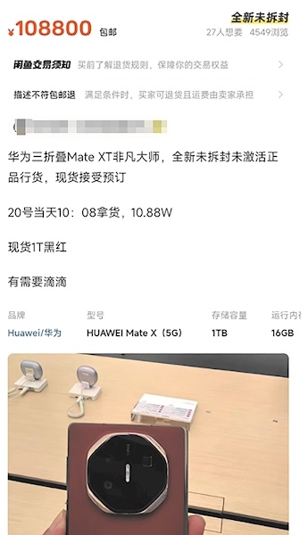 记者注意到,在一些二手商品网络平台,已有人挂出帖子称可以加价购买该款手机。一些网帖称已在线下门店预约,待正式发售提货后出售,需要溢价。在某二手电商平台,一卖家标称“华为Mate XT非凡大师,全新未拆封未激活正品行货,现货接受预订,20号当天拿货”,标价为10.88万元。还注明是正品未开封,但无法开具发票。
