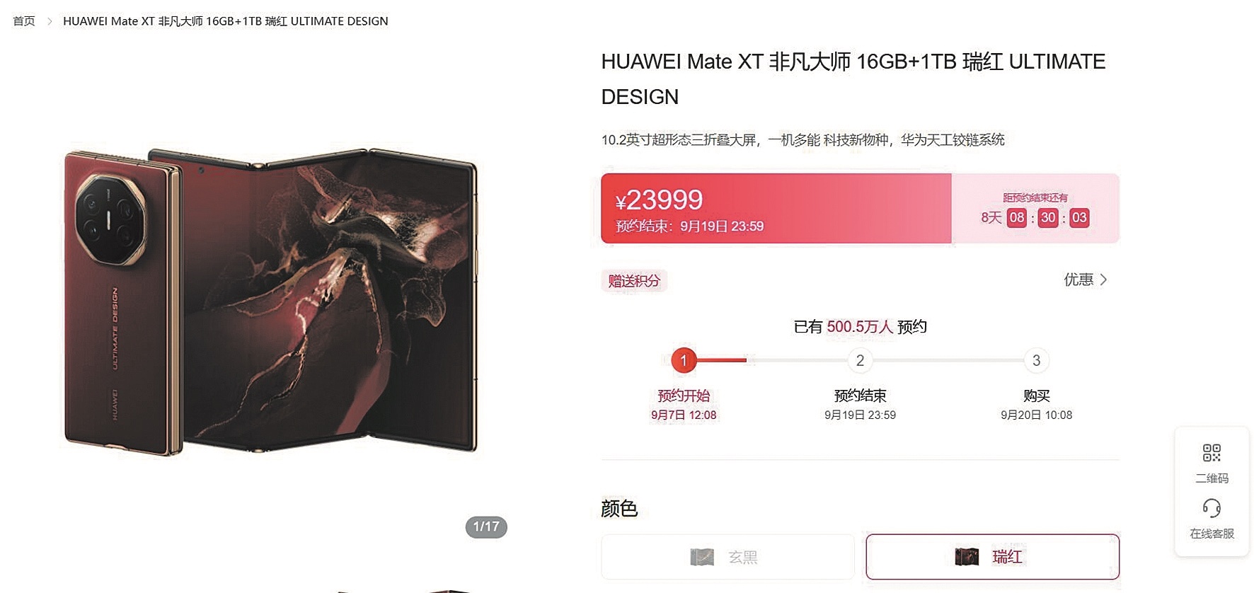 华为官网显示,HUAWEI Mate XT非凡大师正式开售时间为9月20日,截至9月11日下午,华为商城预约人数已超500万人。