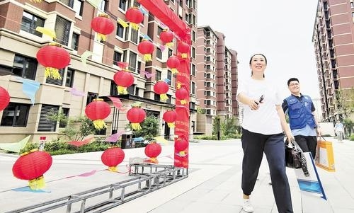9月7日,雄安新区容西片区馨水东湾小区内,志愿者带着回迁居民(左)喜看新家。记者 刘光昱 摄
