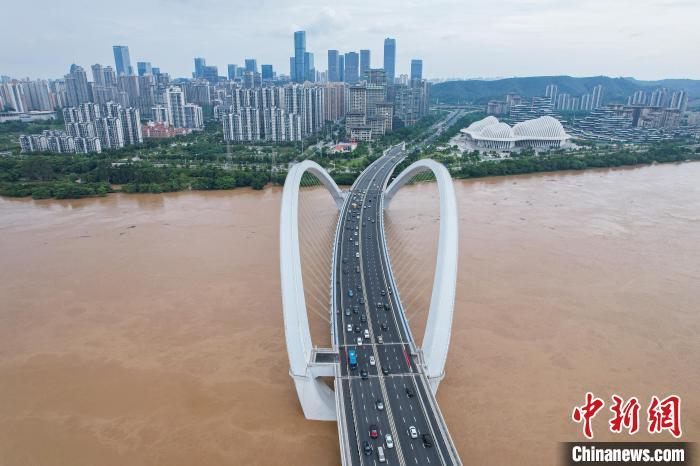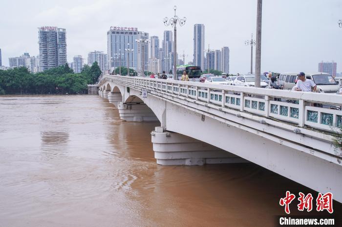 9月11日,洪水通过广西南宁邕江大桥。受郁江2024年第1号洪水影响,当日郁江南宁市城区河段(邕江)水位持续上涨,部分沿江步道、设施被淹。 中新社记者 陈冠言 摄