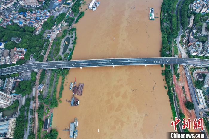 9月11日,航拍广西南宁大桥。受郁江2024年第1号洪水影响,当日郁江南宁市城区河段(邕江)水位持续上涨,部分沿江步道、设施被淹。(无人机照片) 中新社记者 陈冠言 摄