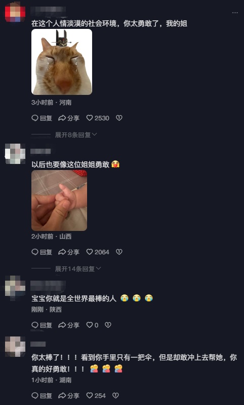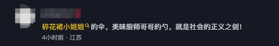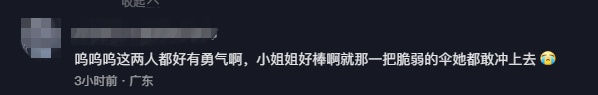 网友也纷纷在评论区为见义勇为的两人点赞“碎花裙小姐姐的伞,美味厨师哥哥的勺,就是社会的正义之剑!”