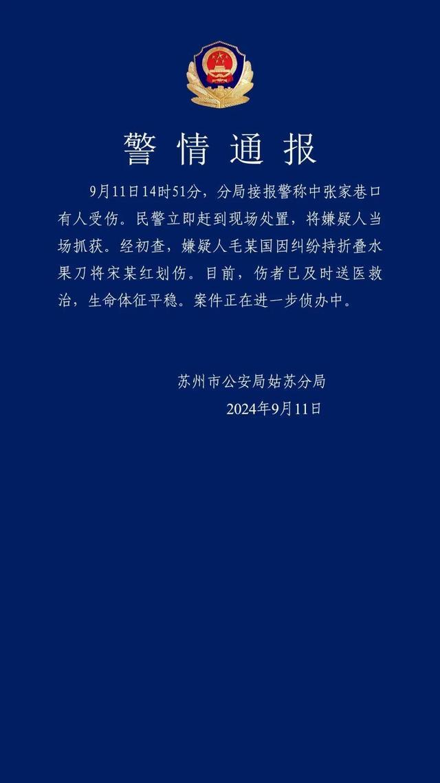 9月11日,苏州市公安局姑苏分局发布警情通报:9月11日14时51分,分局接报警称中张家巷口有人受伤。民警立即赶到现场处置,将嫌疑人当场抓获。经初查,嫌疑人毛某国因纠纷持折叠水果刀将宋某红划伤。目前,伤者已及时送医救治,生命体征平稳。案件正在进一步侦办中。
