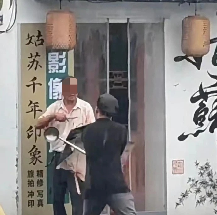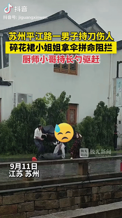 9月11日,江苏苏州平江路一男子持刀伤人,只见一穿着碎花长裙的女生拿伞拼命击打行凶者,随后,一名厨师小哥持长勺将行凶者驱赶。