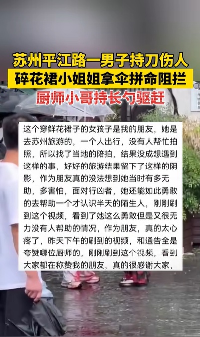 事件发生后,拿伞击打行凶男子的碎花裙女子信息并不为人所知,随着事件在网络曝光,该女子的朋友也在网络发声表示:“这个穿鲜花裙子的女孩子是我的朋友,她是去苏州旅游的,一个人出行,所以找了当地的陪拍。作为朋友真的没法想到她当时有多无助,多害怕,面对行凶者,她还能如此勇敢的去帮助一个才认识半天的陌生人……看到大家都在称赞我的朋友,真的很感谢大家。”