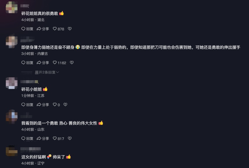 随着穿碎花裙女生账号的曝光,网友们也纷纷去其账号评论区为其点赞:“碎花裙不只是裙子,也可能是英雄的战甲。”“你太棒了!!!看到你手里只有一把伞,但是却敢冲上去帮她,你真的好勇敢!!!”