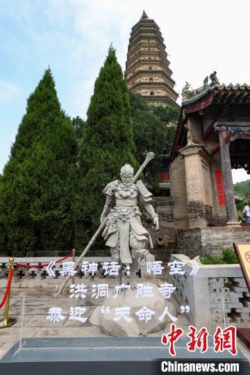 洪洞广胜寺前矗立着《黑神话:悟空》里的悟空雕像。武俊杰摄