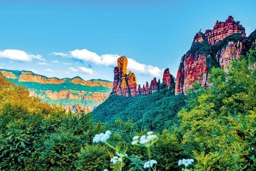 这就是嶂石岩地貌,素有“百里赤壁,万丈红崚”之美誉,与张家界地貌、丹霞地貌并称三大景观砂岩地貌类型。