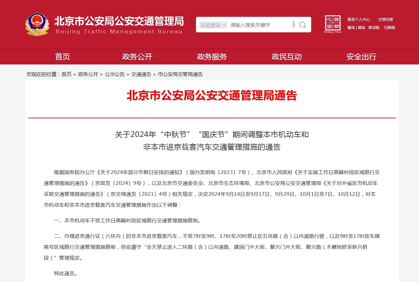 中新网9月13日电 据北京市公安局公安交通管理局网站消息,北京市公安局公安交通管理局发布《关于2024年“中秋节”“国庆节”期间调整本市机动车和非本市进京载客汽车交通管理措施的通告》,决定2024年9月14日至9月17日、9月29日、10月1日至7日、10月12日,对本市机动车和非本市进京载客汽车交通管理措施作出以下调整: