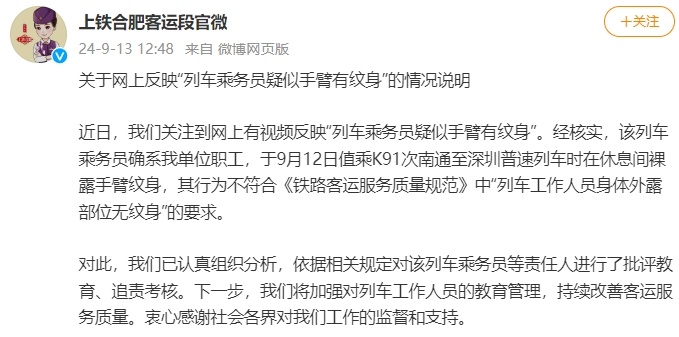 中新网9月13日电 据上海铁路局合肥客运段官方微博消息,上铁合肥客运段13日发布情况说明称,近日,关注到网上有视频反映“列车乘务员疑似手臂有纹身”。经核实,该列车乘务员确系单位职工,于9月12日值乘K91次南通至深圳普速列车时在休息间裸露手臂纹身,其行为不符合《铁路客运服务质量规范》中“列车工作人员身体外露部位无纹身”的要求。