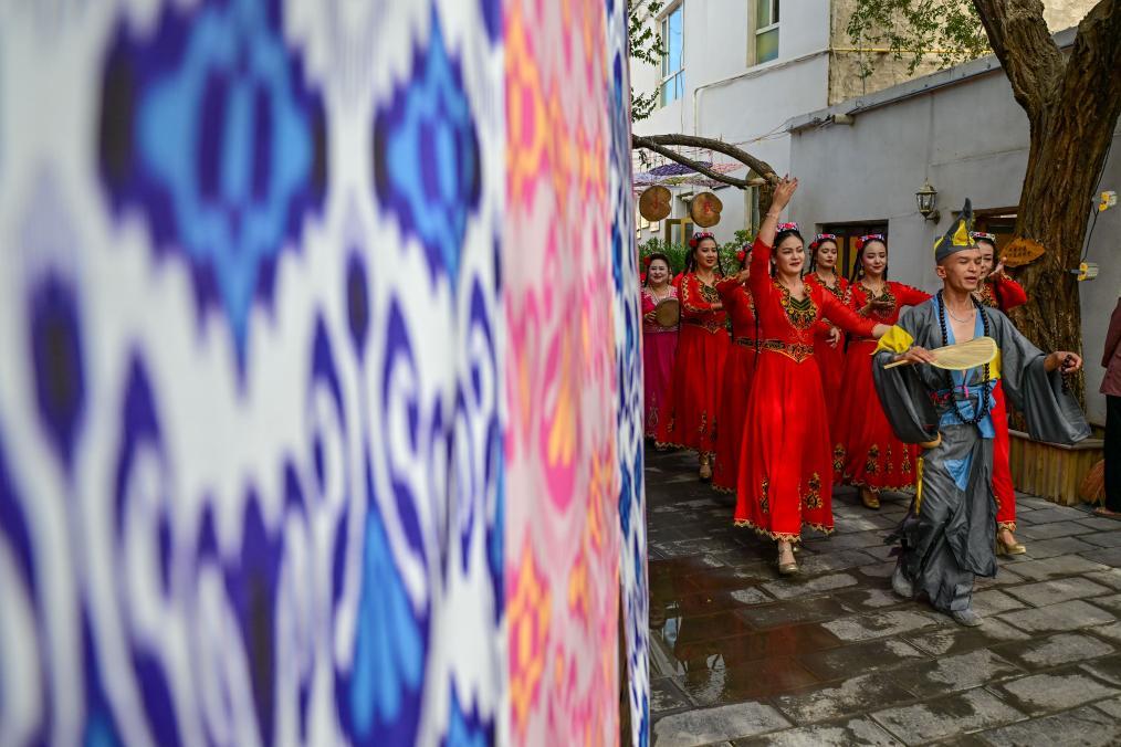 在新疆库车市龟兹小巷,乐舞表演团队在小巷巡演。新华社记者 丁磊 摄