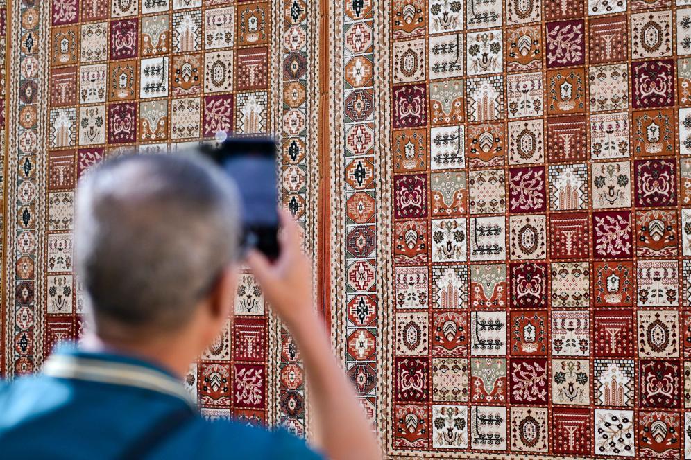 步入龟兹小巷,一幅巨大的地毯墙首先映入眼帘,地毯上大大小小的方格整齐排列,图案精美对称、色彩艳丽。地毯是新疆少数民族家庭中最常见的装饰品,一般以羊毛剪裁编织而成,集绘画、雕刻、编织、刺绣、印染等手工技艺于一体,是展现新疆民族风情的典型物品之一。