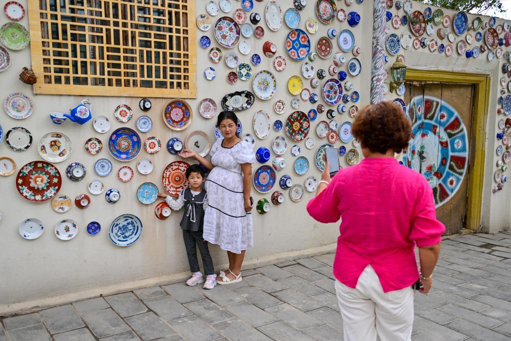 游客在新疆库车市龟兹小巷拍照留念。新华社记者 丁磊 摄