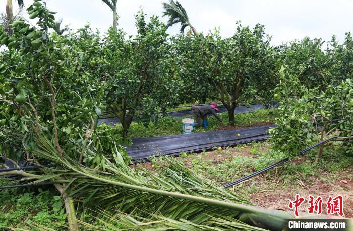 9月10日,海南省澄迈县偲林农场,工人在果树下拾捡被台风刮落的橙子。 中新社记者 王晓斌 摄