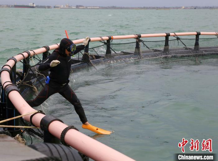 9月11日下午,海南临高后水湾一带,潜水员莫壮雄跳入海中,查验深水网箱的受损状况。 中新社记者 王晓斌 摄