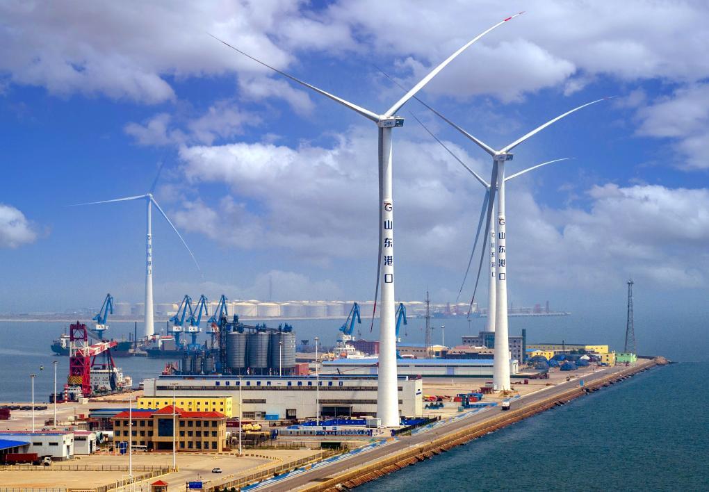 这是2024年6月20日拍摄的山东潍坊港码头上屹立的风机(无人机照片)。潍坊港区的碳排放量基本为零,所产的电还能上电网,降低企业用电成本。新华社发