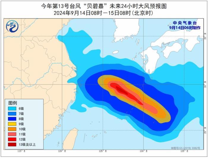 大风预报:9月14日08时至15日08时,东海大部海域、浙江东北部沿海、上海沿海将有6-8级、阵风9-10级的大风,其中东海东北部部分海域将有9-11级、阵风12-13级的大风,“贝碧嘉”中心经过的附近海域或地区风力可达12-13级、阵风14级。