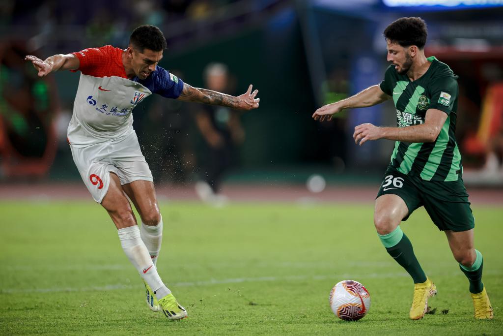9月13日,上海申花队球员安德烈·路易斯(左)在比赛中射门得分。新华社记者 江汉 摄