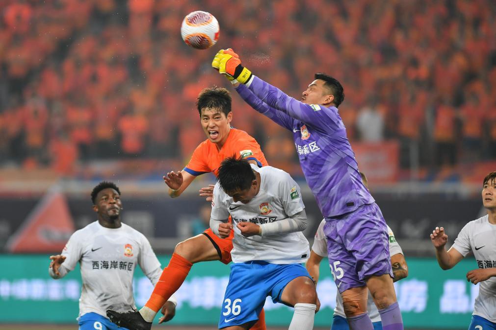 9月13日,青岛西海岸队守门员石笑天(右二)在比赛中防守。新华社记者 朱峥 摄