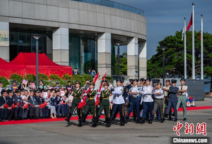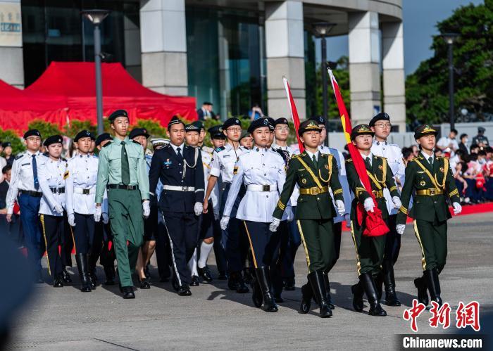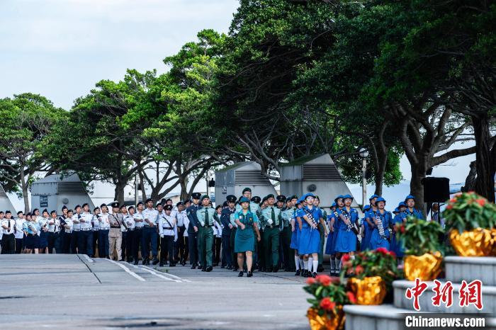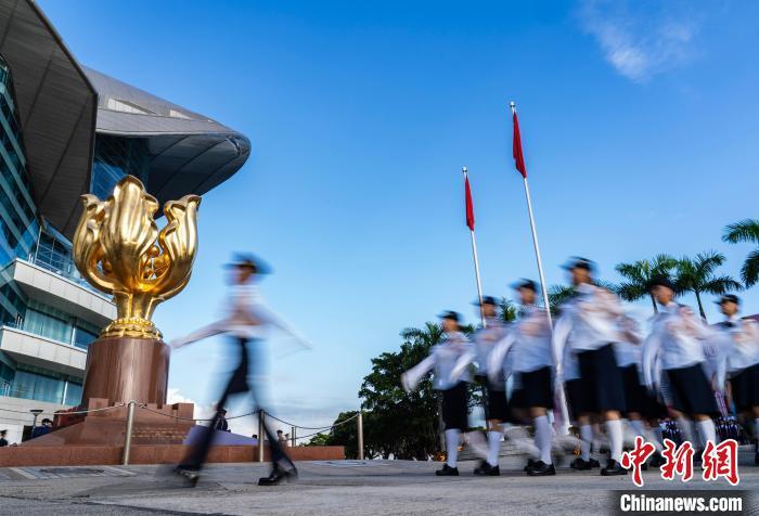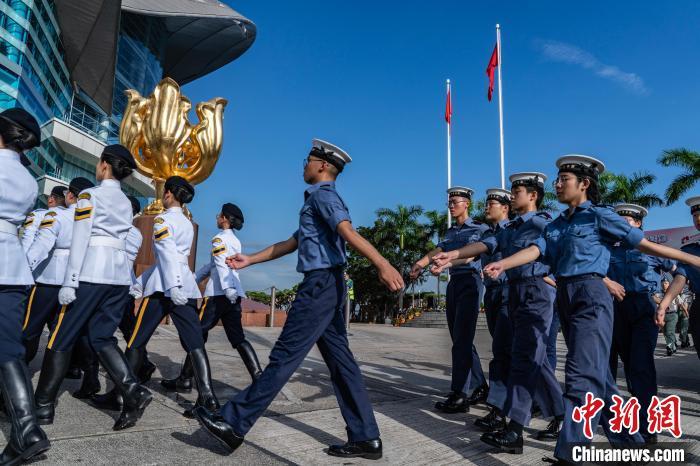 图为青少年制服团队列队经过国旗、区旗和金紫荆雕塑。中新网记者 侯宇 摄