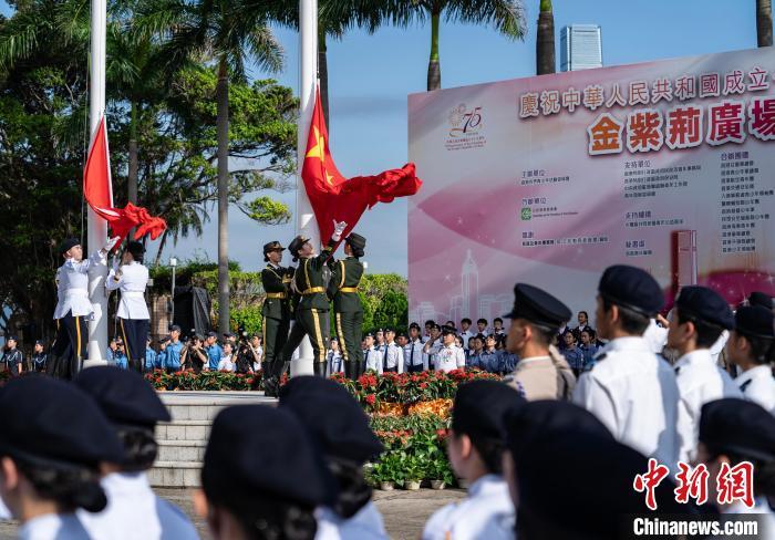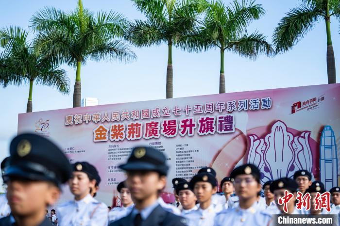 9月14日上午,750名香港特区青少年制服团队成员和中小学生参加由香港各界青少年活动委员会主办的金紫荆广场升旗仪式,迎接中华人民共和国成立75周年。图为青少年升旗手升起国旗和区旗。中新网记者 侯宇 摄