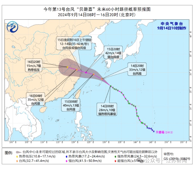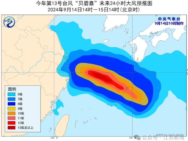 大风预报:9月14日14时至15日14时,东海大部海域、浙江东北部沿海、上海沿海、江苏东南部海域将有6-8级、阵风9-10级的大风,其中东海北部部分海域将有9-11级、阵风12-13级的大风,“贝碧嘉”中心经过的附近海域或地区风力可达12-13级、阵风14级。