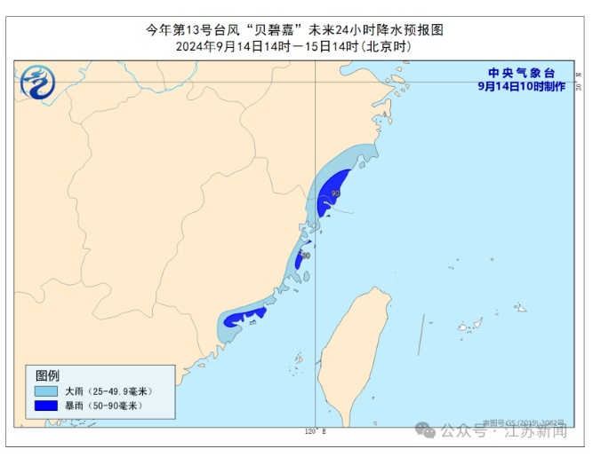 降水预报:9月14日14时至15日14时,浙江东南部、福建东部部分地区有大雨,局地暴雨(50-90毫米)。