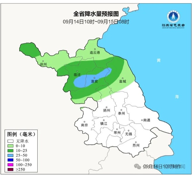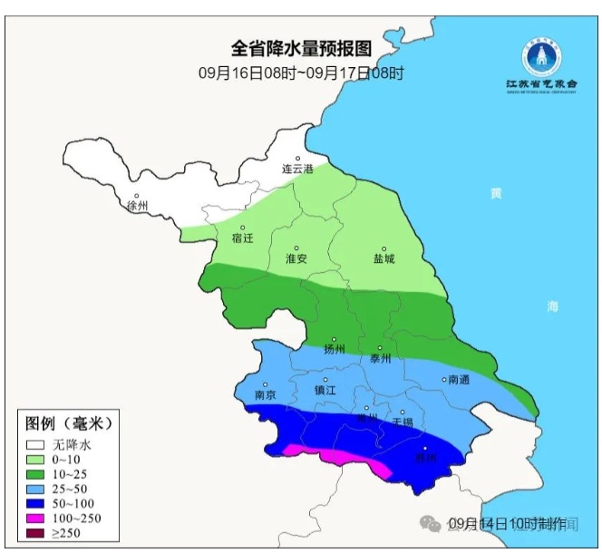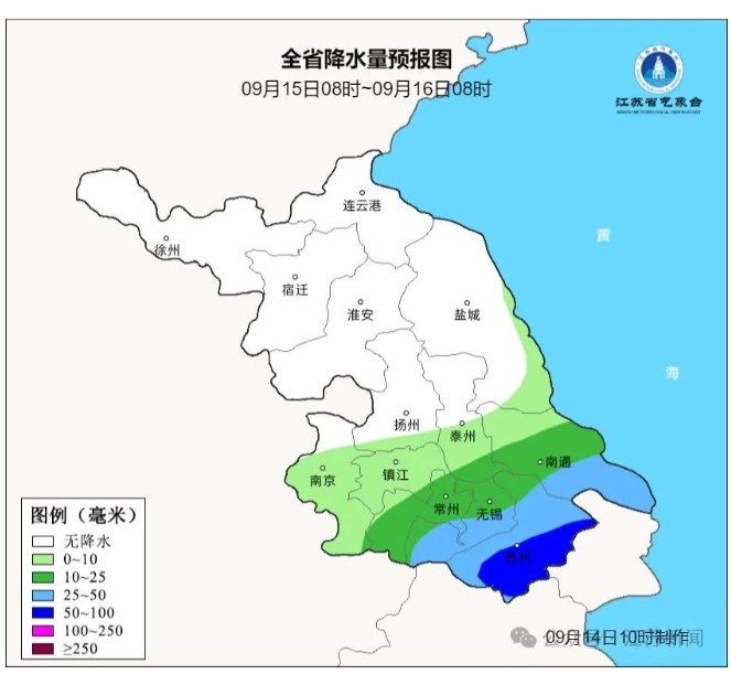 9月15日08时至9月16日08时,沿江和苏南地区多云转阴有阵雨或雷雨,其中本省东南部地区中到大雨,部分地区暴雨,其他地区多云到阴。最高温度:本省东南部地区32℃左右,淮北地区27~ 28℃,其他地区29~ 30℃。最低温度:江淮之间东部和苏南地区25~ 26℃,本省西北部地区19~ 20℃,其他地区23℃左右。全省东北风,风力:苏南地区5级阵风6-7级逐渐增强至9-10级阵风11-12级,其他地区5级阵风6-7级。