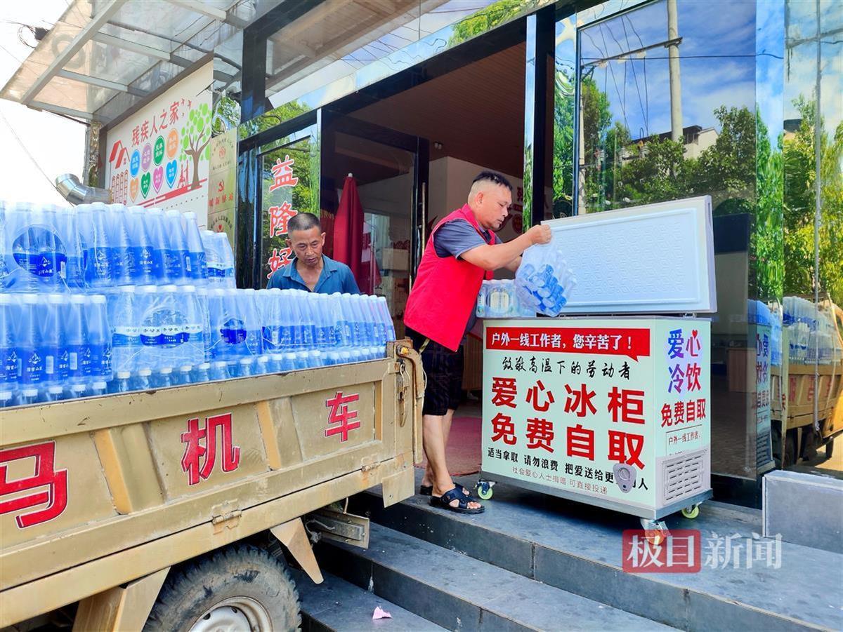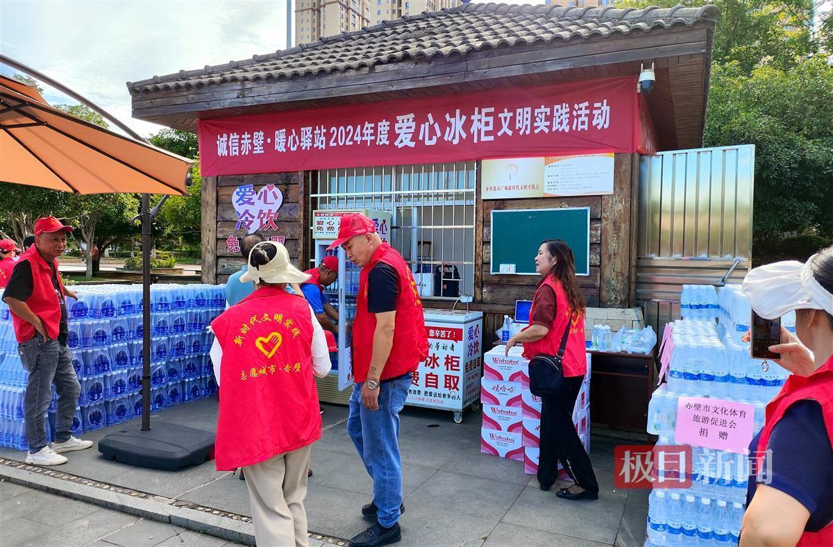 据极目新闻记者了解,“爱心冰柜”是在赤壁市文明办主导下打造的品牌文明实践项目,由红心志愿服务队承接并实施,2023年在赤壁北站设立“爱心冰柜”新时代文明实践点,2024年在“爱心粥屋”同步增设“爱心冰柜”新时代文明实践点,主要为环卫工人、交警、快递小哥、外卖骑手、建筑工人、电力工人等户外工作者及到赤壁的游客免费提供饮用水。
