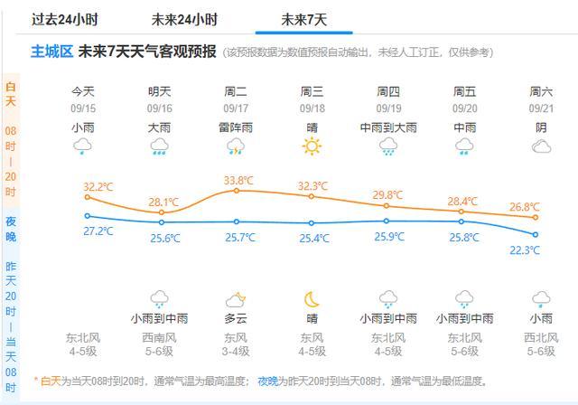 市区天气预报:今天白天多云到阴,有短时阵雨;今天夜里到明天阴有大到暴雨;后天多云到阴,有时有阵雨。今天北到东北风中午起逐渐增大到6-7级阵风8级。明天白天最高气温29度,明天早晨最低气温25度。明天平均相对湿度75%。