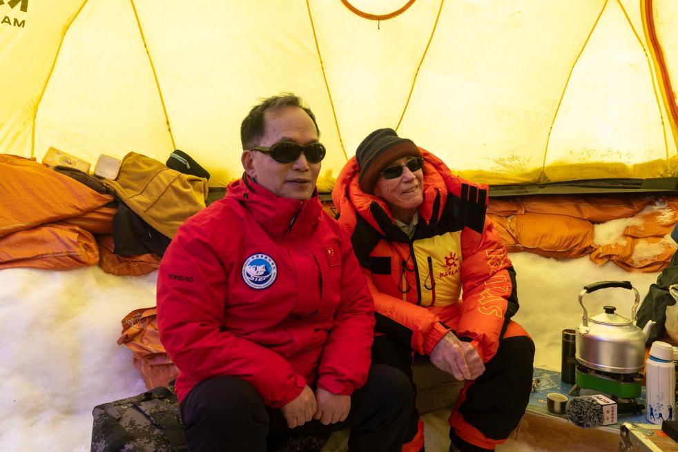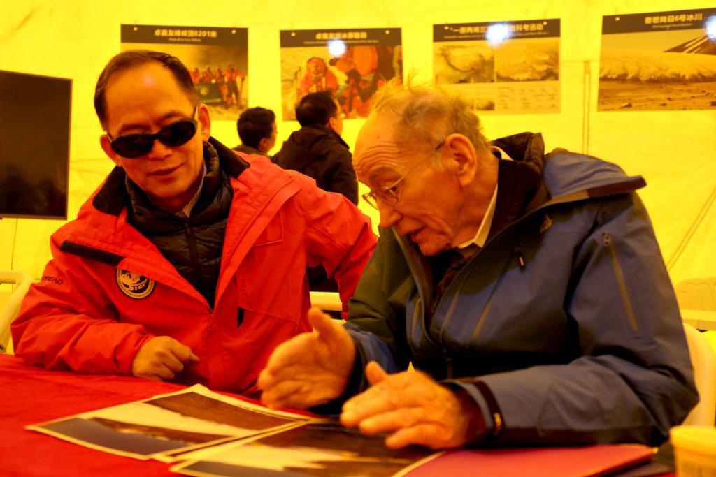 汤普森(右)、姚檀栋(左)在察看普若岗日冰原6号冰川冰穹A作业点返回营地后讨论冰芯钻取情况。新华社记者刘诗平 摄