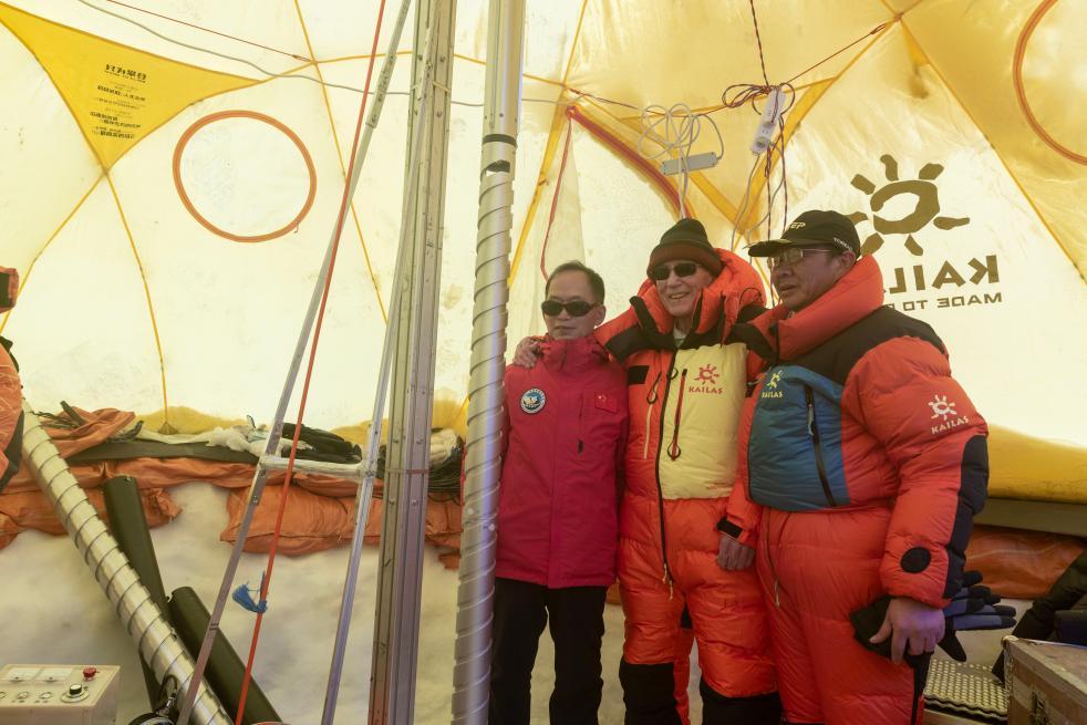 姚檀栋(左一)、汤普森(左二)在普若岗日冰原10号冰川冰穹C作业点工作帐篷内与冰芯钻取工作负责人徐柏青研究员合影。新华社记者姜帆 摄