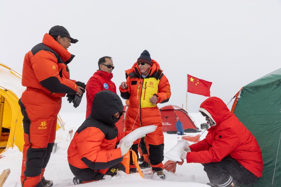 姚檀栋(站立左二)、汤普森(站立左三)在海拔6100米的普若岗日冰原冰穹C作业点查看冰芯。新华社记者姜帆 摄