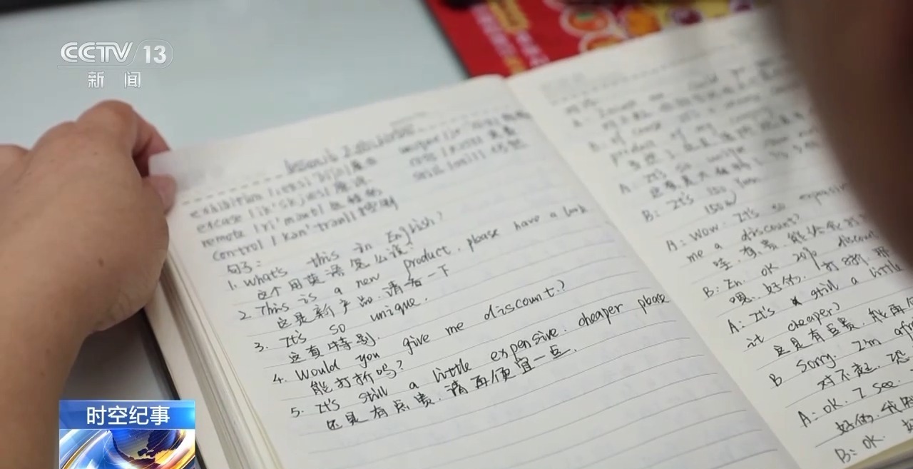 英语加汉语,今年已经50岁的单晨晓努力地跟外商交流着。现在,她的学习劲头也很足,不光桌上放着学习材料,就连货架下方的小角落里也贴满了学习笔记。