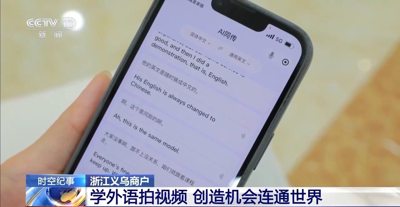 除了线下学习外语,义乌商户还在寻求高科技的助力。2023年10月,义乌推出了一款AI工具软件。打开软件,就可以进行多国语言的同步翻译。不到一年时间,尝试使用AI工具来辅助做生意的义乌商户已超过1万户。