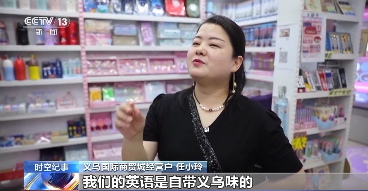 义乌国际商贸城经营户 任小玲:我们的英语是自带义乌味的,我觉得挺自豪,不会觉得丢脸。我觉得义乌腔的外语可以的,行走天下不怕。