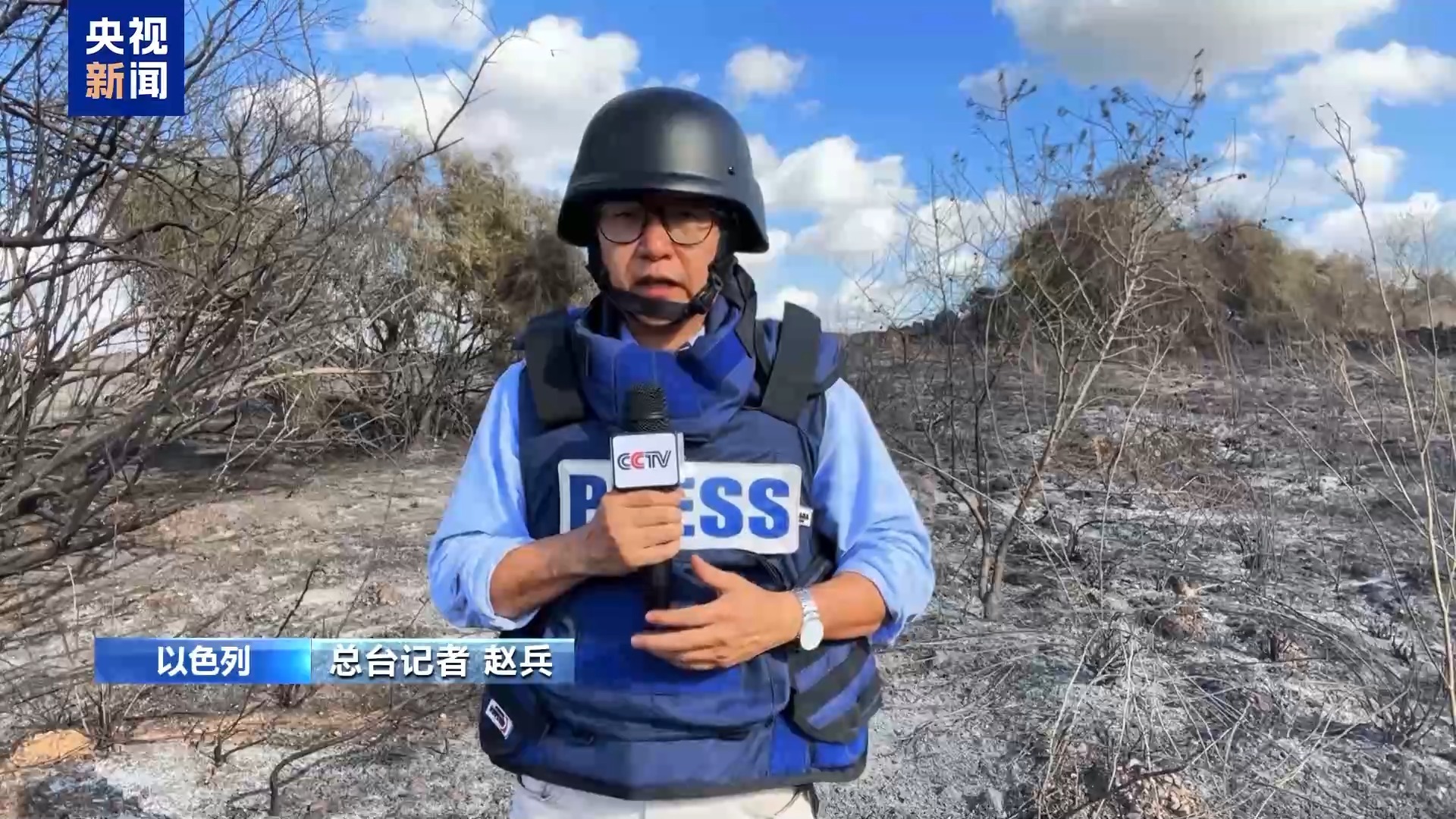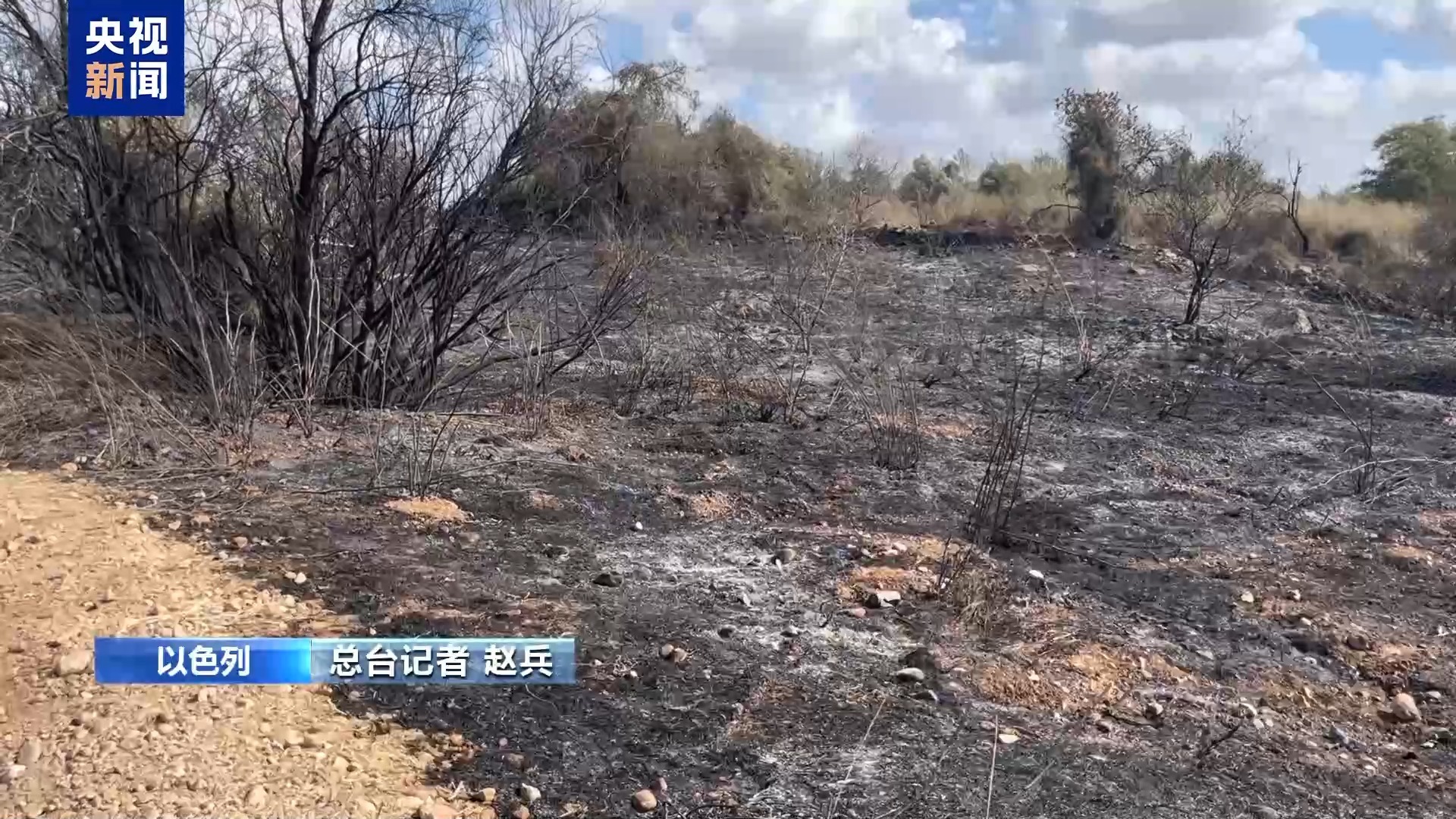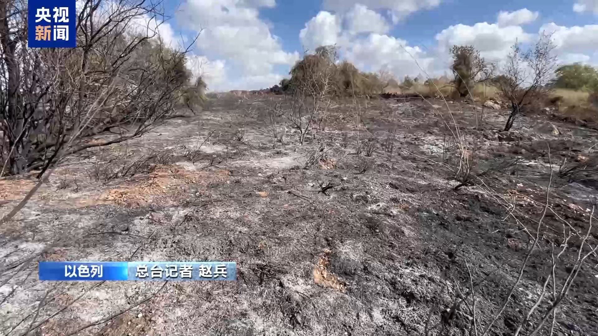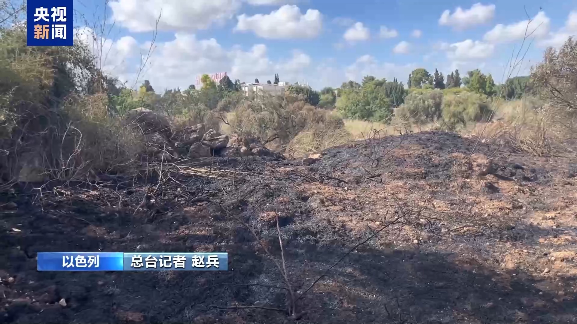 总台记者 赵兵:我现在所在的位置是在以色列中部的一处荒地,当地时间15日清晨,也门胡塞武装向以色列发射了一枚所谓高超音速弹道导弹。根据以色列国防军的说法,在导弹进入以色列境内之后,其通过“铁穹”等防空系统进行了多次拦截,导弹在空中解体,其中一个弹片就坠落到我现在所处的位置,引发火灾。