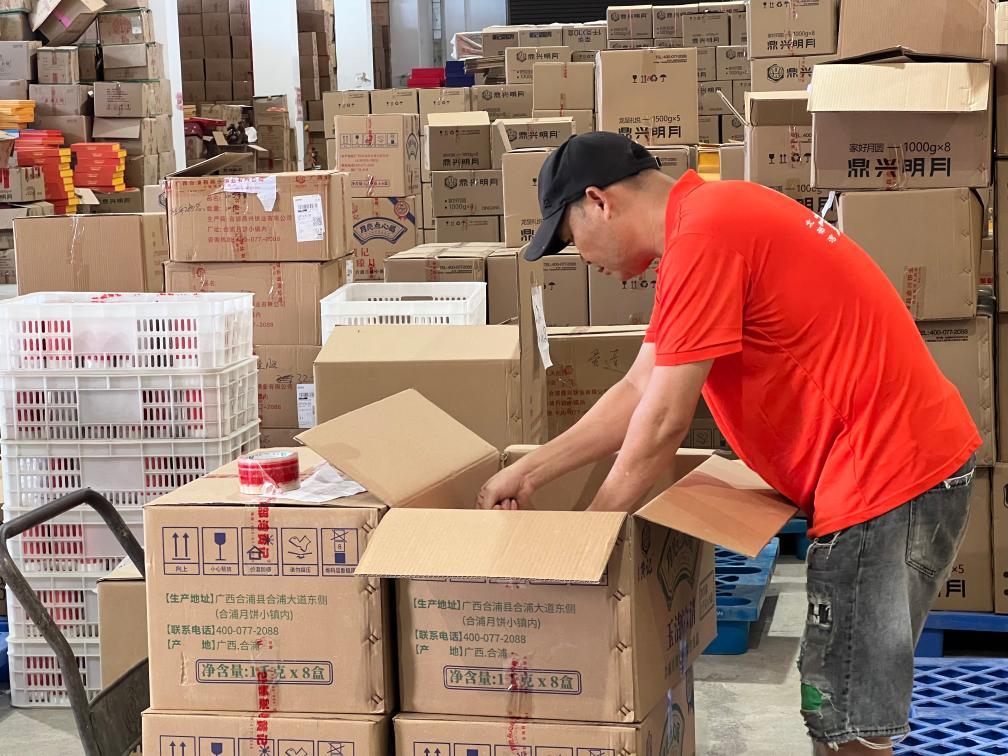 9月12日,在广西北海市合浦县的月饼小镇一处库房内,工人正将月饼打包装箱。新华社记者张卓文 摄