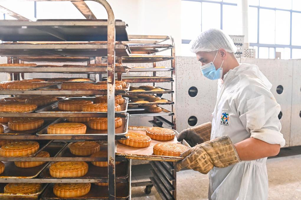 9月11日,在广西北海市合浦县的月饼小镇一处生产车间内,工人将烤好的月饼取出等待冷却。(林启波 摄)